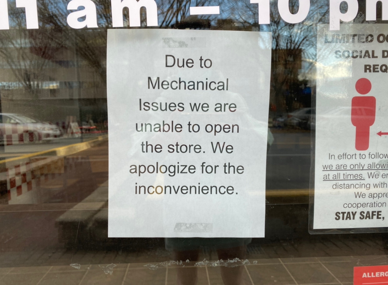 “Due to Mechanical Issues we are unable to open the store,” the sign reads. “We apologize for the inconvenience.”