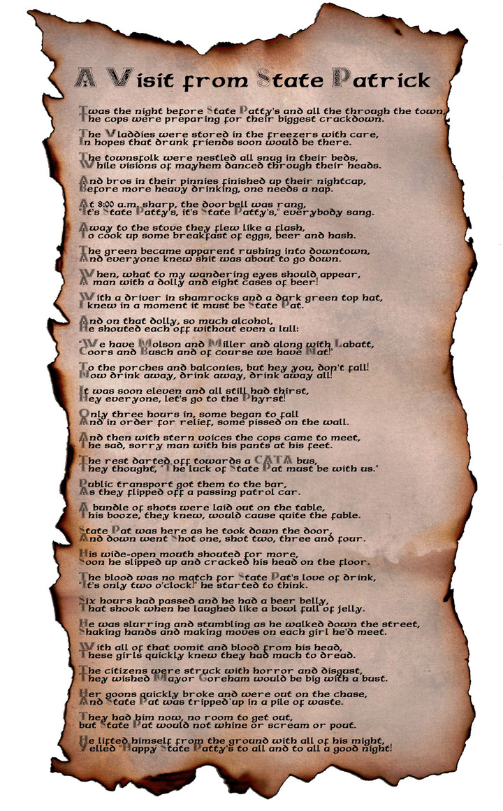 A year ago, I was challenged to come up with a poem about State Patty's Day to which I said, "Challenge accepted". A Visit From State Patrick was born and posted the day before State Patty's 2011. Now, with popular demand wanting it to be republished, I present it to you again. We would just republish the old story, but the poem was printed onto a picture which was lost when we switched servers. It is important to note that this is NOT AN ENDORSEMENT of State Patty's Day. I wrote the poem and I wish the "holiday" would die once and for all. That should quell any fears of the editorial staff being hypocrites as it pertains to SPD.